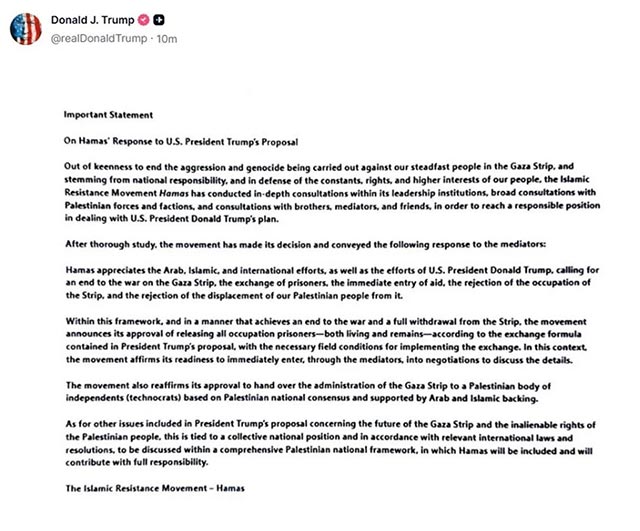 Ayrıntılı değerlendirmelerden sonra hareket kararını vermiş ve aşağıdaki yanıtı arabuluculara iletmiştir:Hamas, savaşın ve Gazze Şeridi’ndeki yıkımın sona erdirilmesi, esirlerin değişimi, insani yardımın derhal girişine izin verilmesi, işgalin reddi ve Filistin halkının yerinden edilmesine karşı çıkılması çağrılarından ötürü Arap, İslami ve uluslararası çabaları ve ayrıca ABD Başkanı Donald Trump’ın girişimlerini takdir etmektedir.