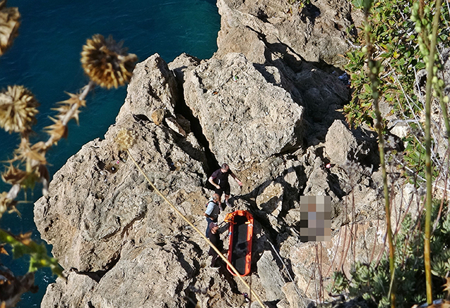 Belirtilen adrese ulaşan Antalya Büyükşehir Belediyesi İtfaiye ekipleri, halatlar yardımıyla 25 metrelik falezlerden aşağı inerek Sami Kırkuşu'na ulaştı. Kayalıkların zorlu yapısı nedeniyle cenazenin yukarı çekilmesi yaklaşık 2 saat sürdü.