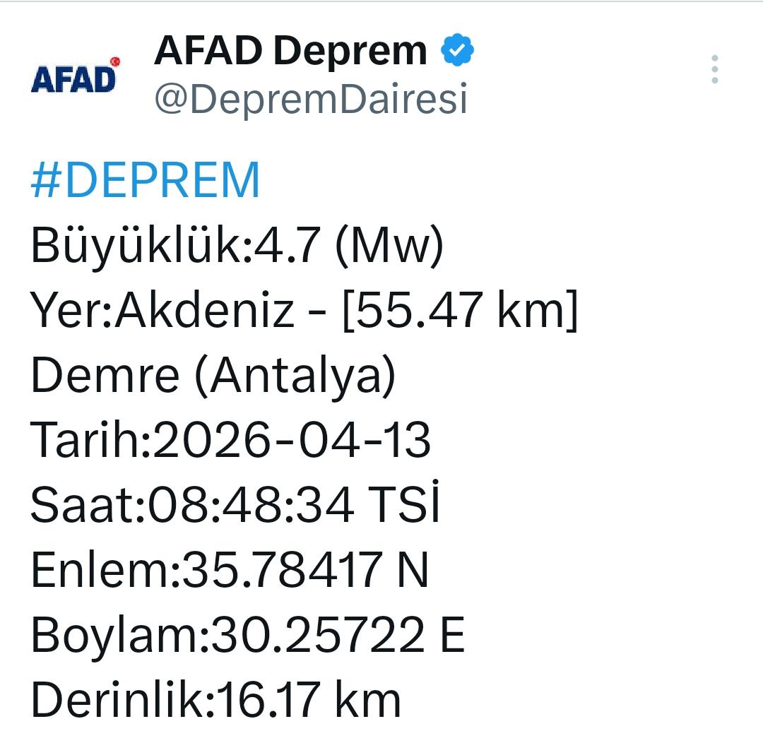 Antalya Yayınlanma: 13 Nisan 2026 - 09:03 Antalya'da 4,7 büyüklüğünde deprem Antalya'nın Demre ilçesi açıklarında 4,7 büyüklüğünde deprem meydana geldi. Antalya 13 Nisan 2026 - 09:03 Yorumlar TAKİP ET A Büyüt A Küçült Yorumlar Antalya'nın Demre ilçesi açıklarında 4,7 büyüklüğünde deprem meydana geldi. Antalya’da hissedilen deprem meydana geldi. Afad tarafından açıklanan rakamlarda depremin 4.7 şiddetinde olduğu öğrenildi. # antalya deprem# deprem# antalya son dakika deprem# antalya demre deprem# antalya deprem son dakika YORUMLAR adlı kullanıcıya cevap x Gönder İlginizi Çekebilir Antalya Demre'de 5 dakika arayla iki ayrı deprem! Büyükşehir’den Parkinson hastalarına özel eğitim Sırtı yere gelmez baş pehlivan Ali Gürbüz Antalya Kepez Belediyesine transfer oldu Kuzugöbeği mantarı kaç para? Hangi şehirlerde ve ne zaman yetişiyor? Son Haberler Çarpmanın etkisiyle 20 metre uzağa fırladılar ! Dünya saatini 17.00'ye kurdu! İran'dan peş peşe sürpriz açıklamalar Antalya'da şok olay: Reçete ile uyuşturucu aldılar! Doktora ve eczaneye... Antalya Demre'de 5 dakika arayla iki ayrı deprem! Akaryakıtta indirim kapıda: Motorine indirim ne zaman? Kaç tl düşecek! Akaryakıtta indirim kapıda: Motorine indirim ne zaman? Kaç tl düşecek! Akaryakıtta indirim kapıda: Motorine indirim ne zaman? Kaç tl düşecek!