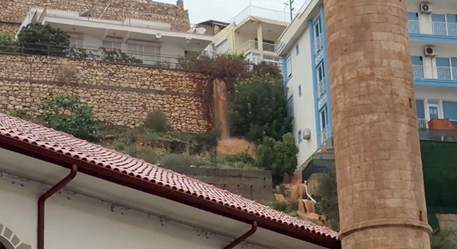 Finike merkezde Atatürk Caddesi ve Merkez Cami arkasındaki binaların istinat duvarları arasından sızan yağmur suları, küçük şelaleler oluşturarak ilginç görüntülere sahne oldu. Vatandaşlar cep telefonlarıyla yaşanan anları kaydetti.
