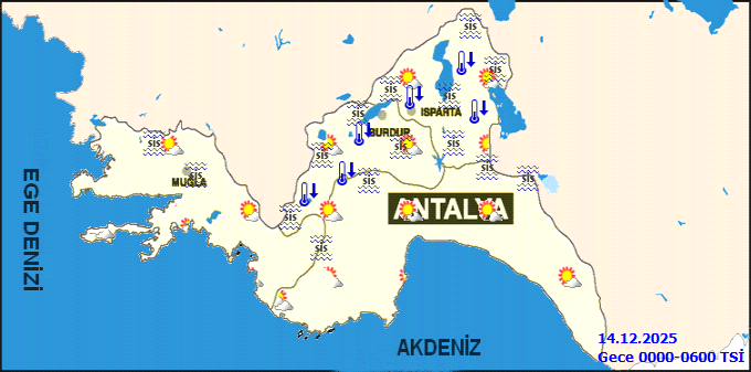 | Korkuteli | Açık, az bulutlu, gece ve sabah saatleri sisli | -1 | 12 |