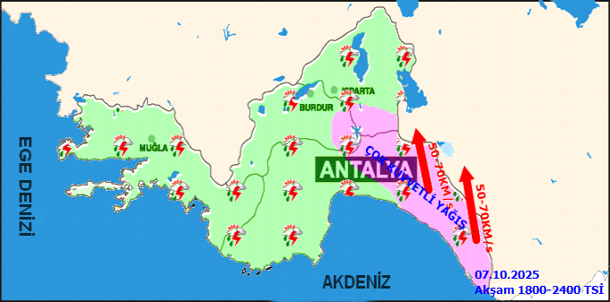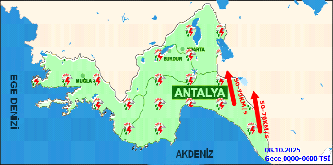 Rüzgarın; Antalya'nın doğu iç kesimlerinde ( İbradı, Akseki ve Gündoğmuş) güney yönlerden kuvvetli rüzgar ve fırtına (50-70 km/saat, yer yer 80 km/saat) şeklinde esmesi bekleniyor.