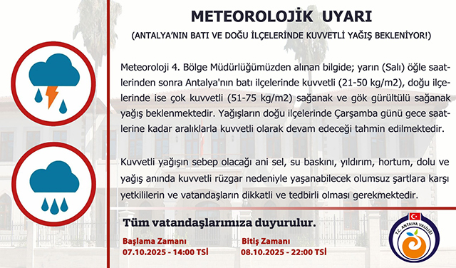 "Meteoroloji 4. Bölge Müdürlüğümüzden alınan bilgide; yarın (Salı) öğle saatlerinden sonra Antalya'nın batı ilçelerinde kuvvetli (21-50 kg/m2), doğu ilçelerinde ise çok kuvvetli (51-75 kg/m2) sağanak ve gök gürültülü sağanak yağış beklenmektedir. Yağışların doğu ilçelerinde Çarşamba günü gece saatlerine kadar aralıklarla kuvvetli olarak devam edeceği tahmin edilmektedir.