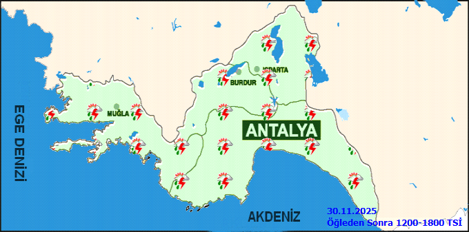 | Korkuteli | Parçalı çok bulutlu, aralıklı sağanak ve gök gürültülü sağanak yağışlı | 2 | 12 |