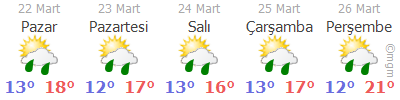 Yarın (23 Mart Pazartesi) ise sabah saatlerinden itibaren aralıklı sağanak yağmur etkili olacak. Sıcaklık gündüz 19–21°C, gece ise 12–13°C dolaylarında. Rüzgâr kuzeydoğudan hafif esecek ve hava gün içinde bulutlu kalacak.