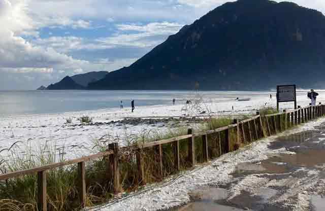 Yağan dolu ile birlikte caretta carettaların yuvalama alanı olarak da tanınan Çıralı sahili tamamen beyaza büründü. Çıralı’da yaşayanlar ve turistler bu anı ölümsüzleştirmek için bol bol fotoğraf ve video çektiler.