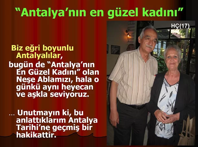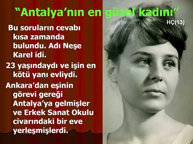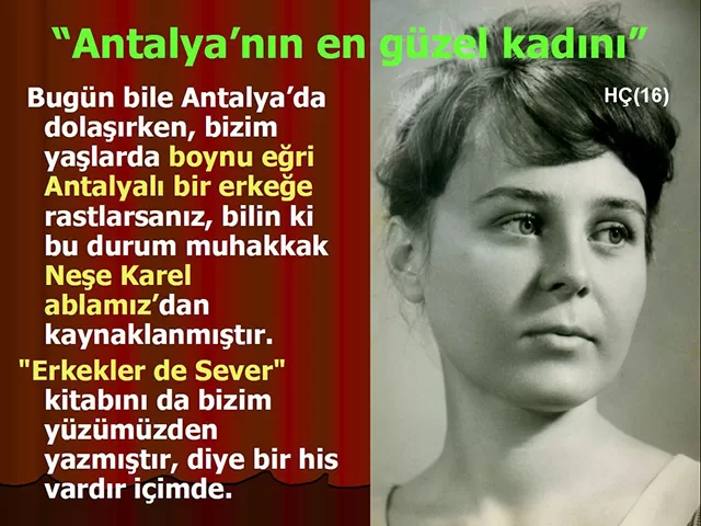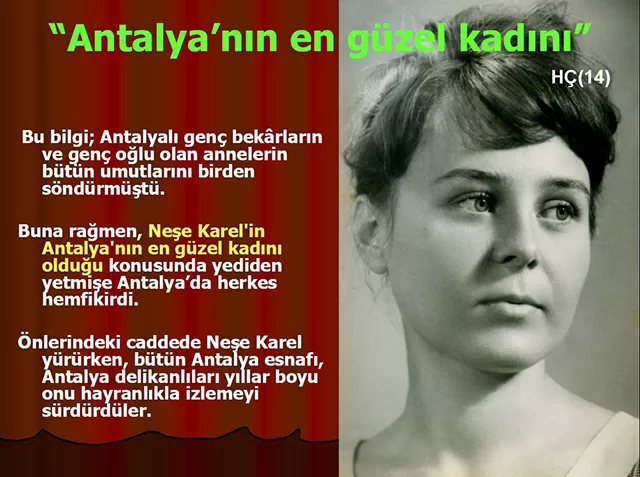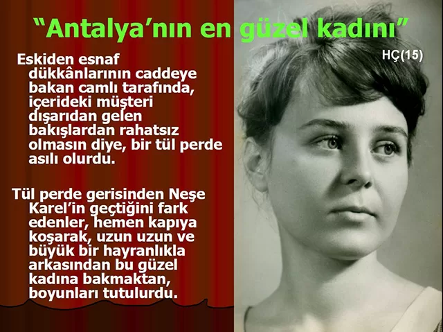 Antalya’nın kent tarihçisi Hüseyin Çimrin, Neşe Karel’in ölümünün ardından bu genç ve güzel kadının yaşamıyla ilgili adeta bir fotoroman hazırlayarak sosyal medya hesabından paylaştı. Çimrin hazırladığı o ilginç fotoromanda, gençliğinde Neşe Karel’e bakmaktan Antalyalı gençlerin boyunlarının eğri kaldığını ifade etti. İşte Hüseyin Çimrin’in Neşe Karel ile ilgili hazırladığı o öykülerle dolu fotoroman;