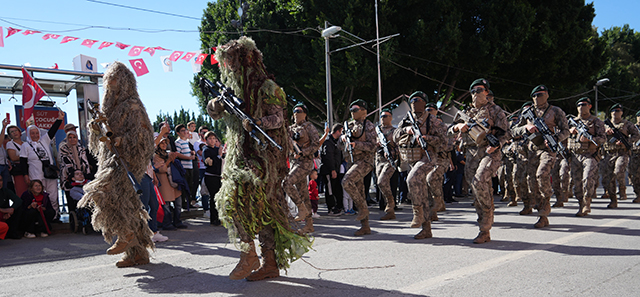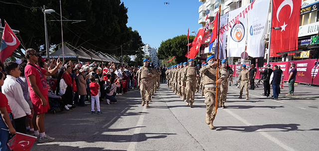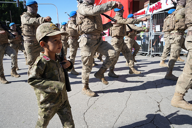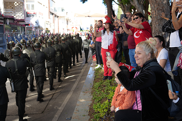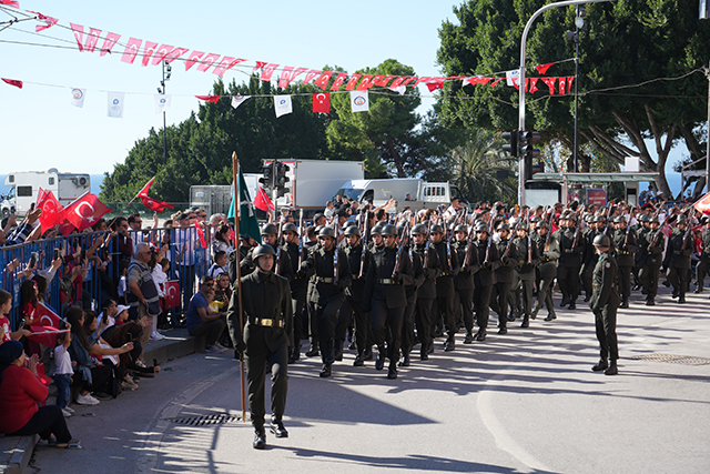 Kutlamaların finalinde ise her yıl merakla beklenen geçit töreni gerçekleştirildi. Ortaöğretim ve lise öğrencilerinin ay-yıldızlı bayraklarla geçişiyle başlayan kortej; gazi ve şehit aileleri dernekleri, 3'üncü Piyade Tugay Komutanlığı birlikleri, jandarma, emniyet, zabıta ve atlı birliklerin katılımıyla sona erdi.