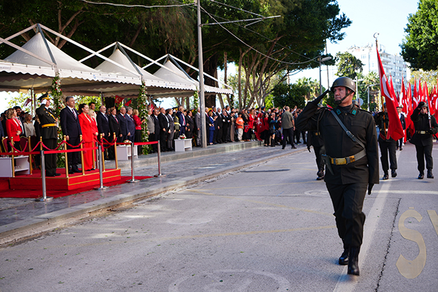 Tören, Antalya Valisi Hulusi Şahin, Büyükşehir Belediye Başkan Vekili Büşra Dirgen Özdemir ve Garnizon Tören Komutanı Tümgeneral Sinan Eren'in halkı selamlamasıyla başladı. Saygı duruşu ve İstiklal Marşı'nın ardından kürsüye gelen Vali Şahin, günün anlam ve önemine değindi.