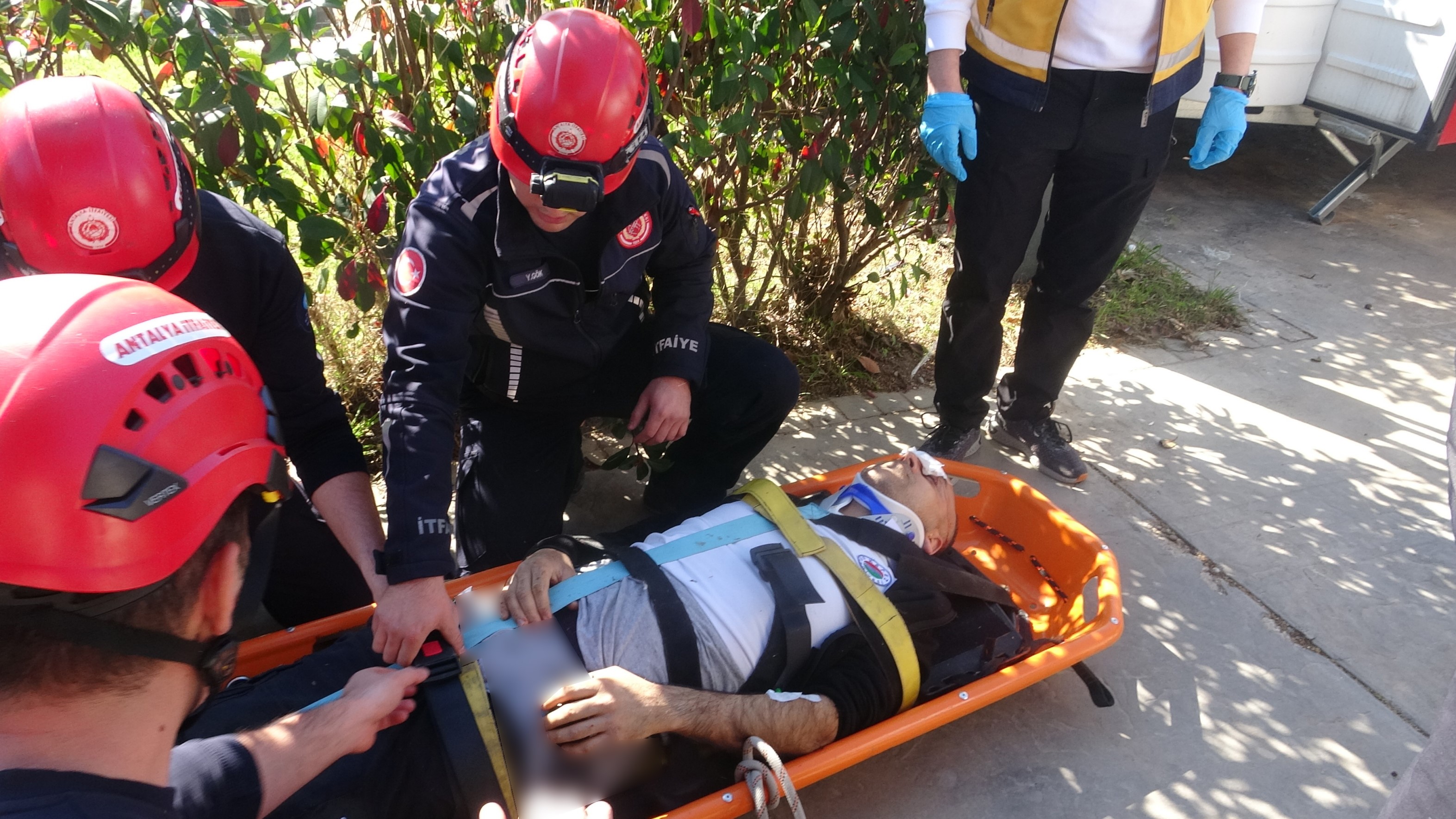 Yaklaşık 20 metre yükseklikten düştüğü öğrenilen Erdinç A.'nın şans eseri düştüğü noktada bulunan incir ağacının dallarının düşüşünü yumuşattığı öğrenildi. Vücudunun çeşitli yerlerinde yaralanmalar olduğu görülen Erdinç A. serum ve boynuna boyunluk takılarak sepet sedyeye sabitlendikten sonra itfaiye ve sağlık ekipleri tarafından patika yol kullanılarak ambulansa taşındı. Yaralı, tedavi edilmek için ambulansla Antalya Eğitim ve Araştırma Hastanesine götürüldü.