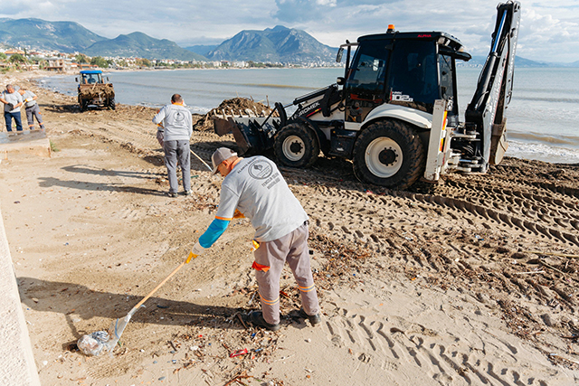 Öte yandan sahil şeridi de yağışların ardından yoğun atık birikimiyle karşı karşıya kaldı. Fırtına sonrası denizden kıyıya vuran plastikler, odun parçaları ve çeşitli atıklar, temizlik ekiplerinin çalışmalarıyla tek tek toplanıyor. Özellikle yerli ve yabancı turistlerin yoğun kullandığı sahillerde, görüntü kirliliğinin tamamen ortadan kaldırılması için çalışmalar aralıksız sürüyor.