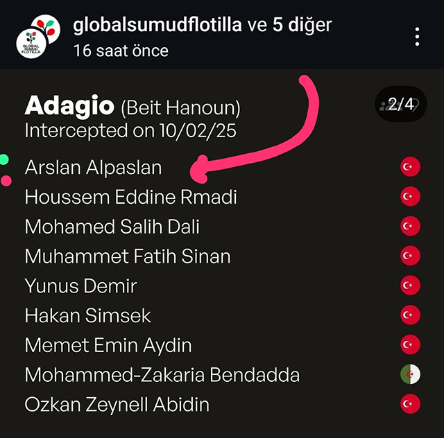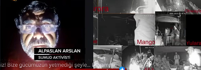 Antalya'dan Sumud'a dahil olan Alanyalı Alpaslan Arslan 44 yardım filosundan biri olan Adaigo gemisinden yaptığı son yayın ile katil İsrail deniz komondolarının yaklaştığını, teknenin etrafını sardığını duyurmuş ve sonra yayın kesilmişti.