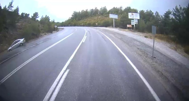 Kazanın başka bir otomobilin araç kamerasına yansıyan görüntülerinde, sürücünün viraja hızlı girdiği, aracın yağış nedeniyle kayarak kontrolden çıktığı ve takla atarak kanala düştüğü anlar net bir şekilde görülüyor.