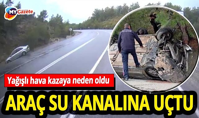 Yağmur nedeniyle ıslanan yolda kaymaya başlayan araç, sürücüsünün kontrolü kaybetmesiyle yoldan çıkarak yağmur suyu tahliye kanalına uçtu ve takla attı.