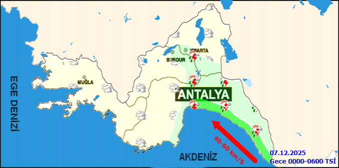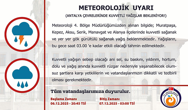 "Meteoroloji 4. Bölge Müdürlüğümüzden alınan bilgide; Muratpaşa, Kepez, Aksu, Serik, Manavgat ve Alanya ilçelerinde kuvvetli sağanak ve yer yer gök gürültülü sağanak yağış beklenmektedir. Yağışların, bu gece saat 03.00 'e kadar etkili olacağı tahmin edilmektedir.Kuvvetli yağışın sebep olacağı ani sel, su baskını, yıldırım, hortum, dolu ve yağış anında kuvvetli rüzgar nedeniyle yaşanabilecek olumsuz şartlara karşı yetkililerin ve vatandaşlarımızın dikkatli ve tedbirli olması gerekmektedir."