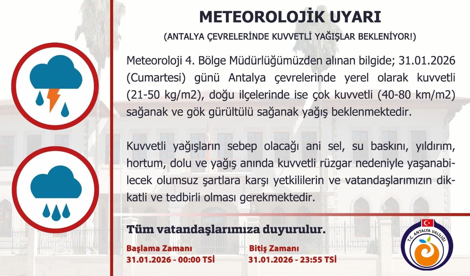 Meteoroloji 4. Bölge Müdürlüğü, Antalya çevreleri için kuvvetli yağış uyarısında bulundu. Yapılan son değerlendirmelere göre, 31 Ocak 2026 Cumartesi günü Antalya genelinde sağanak ve gök gürültülü sağanak yağış bekleniyor.