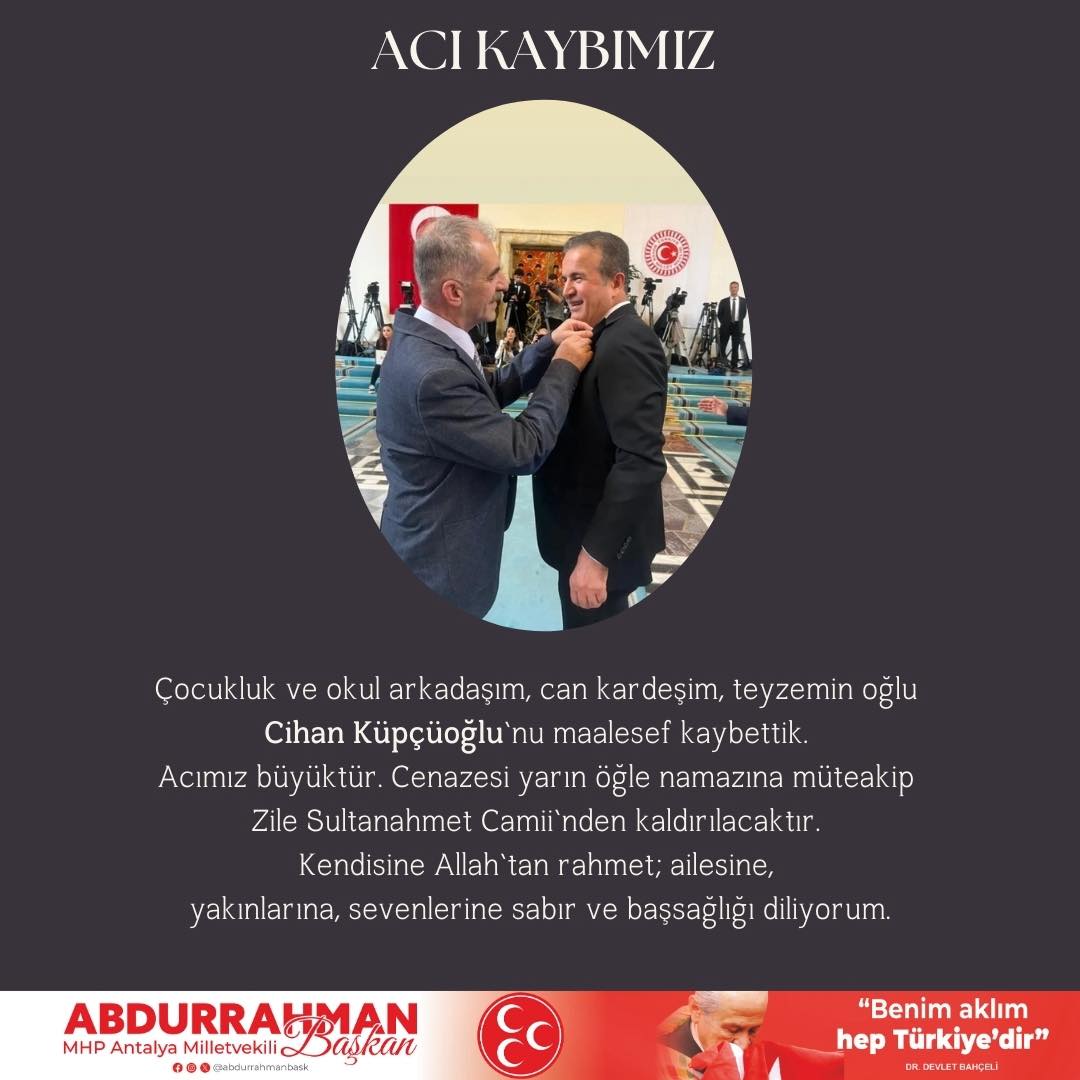 Milletvekili Başkan mesajında, “Çocukluk ve okul arkadaşım, can kardeşim, teyzemin oğlu Cihan Küpçüoğlu’nu maalesef kaybettik. Acımız büyüktür. Cenazesi yarın öğle namazına müteakip Zile Sultanahmet Camii’nden kaldırılacaktır. Kendisine Allah’tan rahmet; ailesine, yakınlarına, sevenlerine sabır ve başsağlığı diliyorum” ifadelerini kullandı.