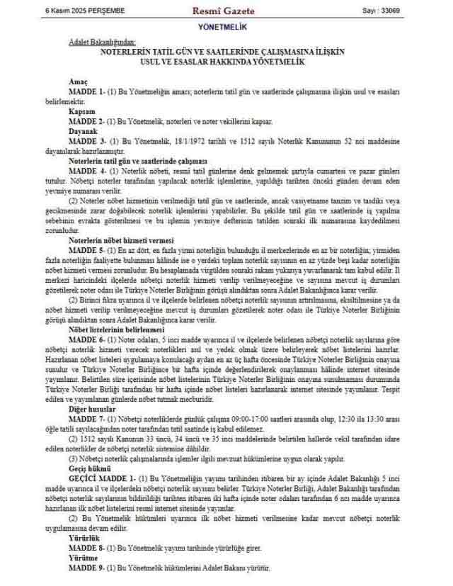 Yeni yönetmeliğe göre, nöbetçi noterlik uygulaması resmi tatillere denk gelmemek kaydıyla hafta sonları geçerli olacak.