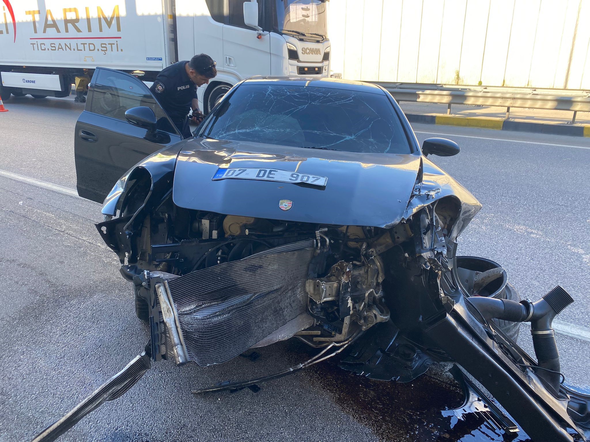 Antalya haber... Kaza, bugün saat 14.00 sıralarında Antalya–Alanya D400 Karayolu Dikmen Alt Geçidi’nde yaşandı. Edinilen bilgilere göre, Davut E. yönetimindeki 07 DE 907 plakalı Porsche, sürücüsünün direksiyon hâkimiyetini kaybetmesi sonucu aynı yönde ilerleyen R.A. idaresindeki 07 ABG 866 plakalı otomobile çarptı.