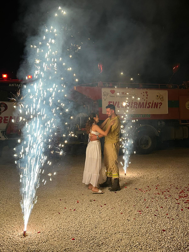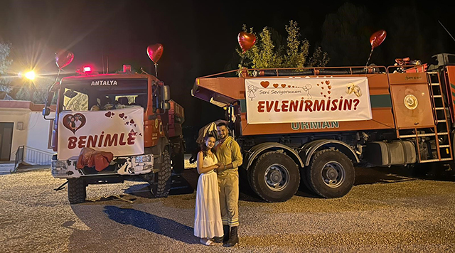 Mesai arkadaşlarının da desteğini alan Deveci, orman yangınlarıyla mücadelede kullandığı arazözün üzerine büyük harflerle “Seni seviyorum, benimle evlenir misin?” yazılı bir pankart astı.