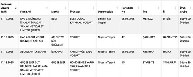 Bakanlık, 5996 Sayılı Veteriner Hizmetleri, Bitki Sağlığı, Gıda ve Yem Kanunu’nun 31’inci maddesi kapsamında, taklit ve tağşiş yapılan ürünleri ifşa etme yetkisini kullanarak tüketicileri bilgilendirdi. Denetimler sonucunda, yoğurtta bulunmaması gereken maddelerin tespit edilmesi üzerine ilgili markalar resmî olarak açıklandı.