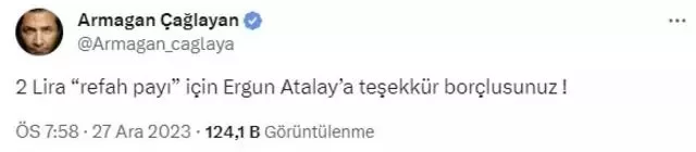 Yeni asgari ücretle beraber en çok konuşulan konular arasına 2 lira detayı girdi. Armağan Çağlayan da konuyla ilgili, "2 Lira 'refah payı' için Ergun Atalay’a teşekkür borçlusunuz!" dedi.