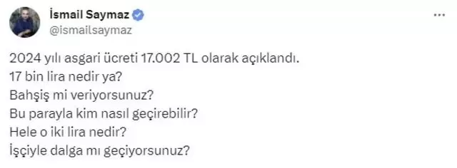 Gazeteci İsmail Saymaz, yeni asgari ücretin belli olmasının ardından sosyal medya hesabındna bir paylaşım yaptı. Saymaz paylaşımında, "2024 yılı asgari ücreti 17.002 TL olarak açıklandı.17 bin lira nedir ya? Bahşiş mi veriyorsunuz? Bu parayla kim nasıl geçirebilir? Hele o iki lira nedir? İşçiyle dalga mı geçiyorsunuz?" ifadelerine yer verdi.